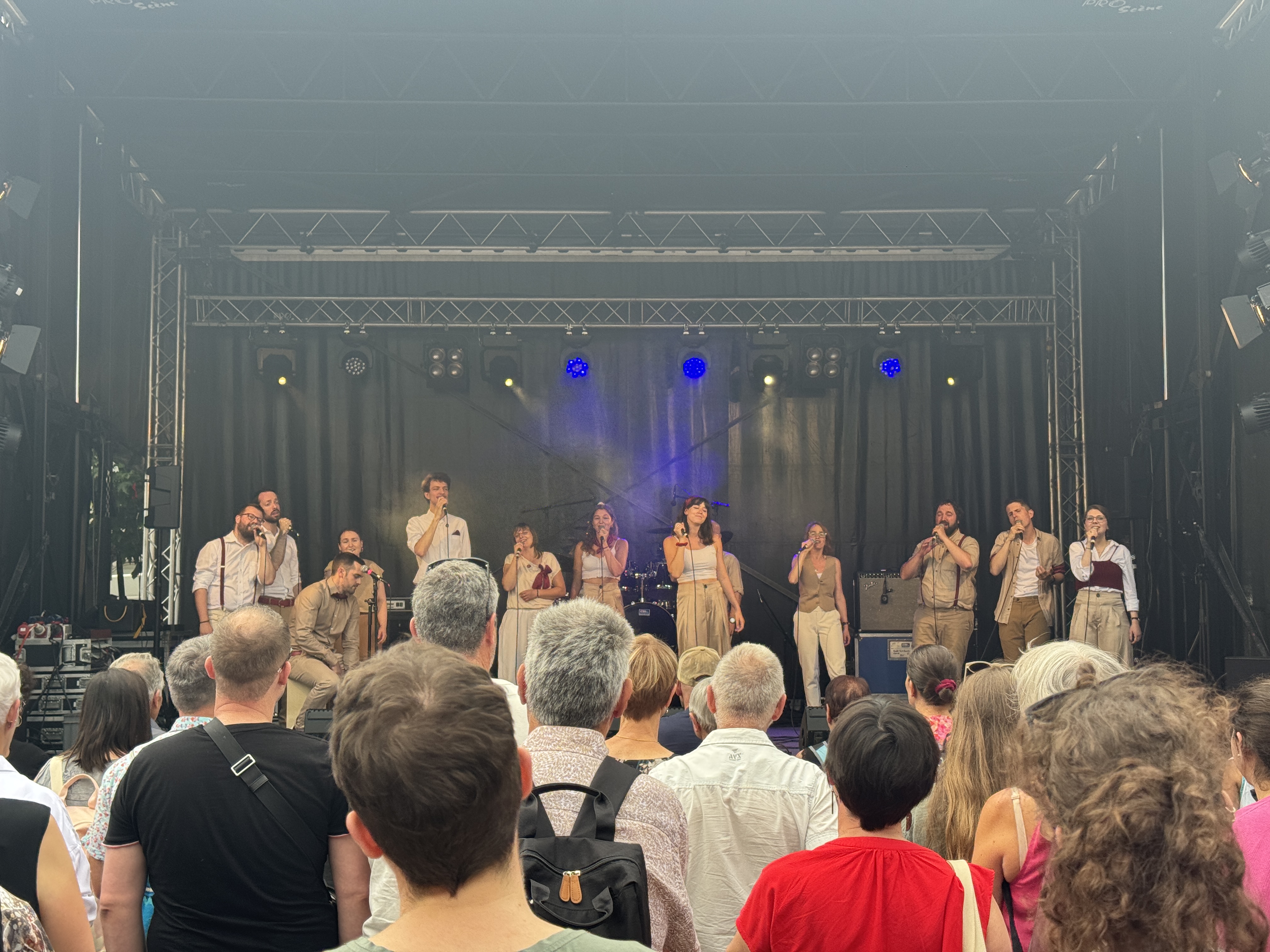 Samedi 21 juin dernier, nous avons eu l'honneur de nous produire sur la grande scène de la Fête de la musique fribourgeoise, située au cœur de la place Georges-Python. Devant un public nombreux et très enthousiaste, nous avons entonné notre répertoire pop en mouvement, malgré une contrainte à laquelle nous n'étions pas habitués : chanter avec micros à la main. Ce n'en fut pas moins une belle fête, rythmée par nos voix et l'énergie échangée entre nous et un public très généreux !