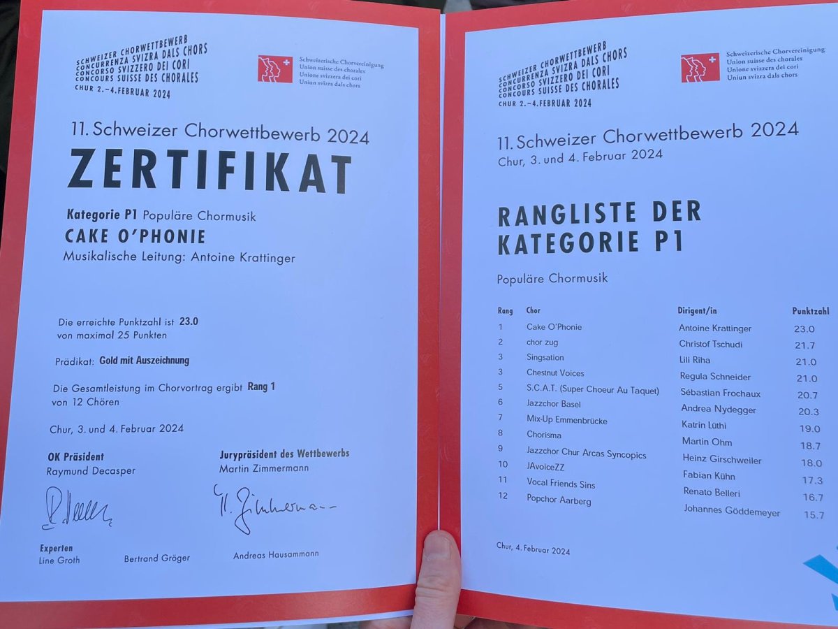 Le week-end du 02 au 04 février 2024, Cake O'Phonie a participé au Concours suisse des chorales dans les Grisons, à Coire. Après avoir performé au Theater Chur devant le jury, l'ensemble a chanté dans ce même lieu dans la soirée dans un concert en mouvement, devant une salle comble. L'ensemble s'est également produit lors de la cérémonie finale primant les meilleurs ensemble et choeurs du pays. Cake O'Phonie termine 1er de la catégorie pop (gold avec félicitations du jury), avec 23.00 points sur 25. Notre prestation filmée en vidéo ci-dessous.